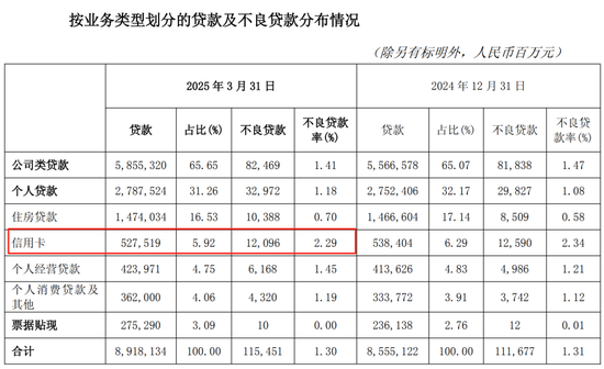 一季报显示,截至2025年3月末,交行信用卡贷款余额5,275.19亿元,较年初减少108.85亿元,占总贷款的比重下降至5.92%。资产质量方面,信用卡不良率较年初下降0.05个百分点至2.29%。