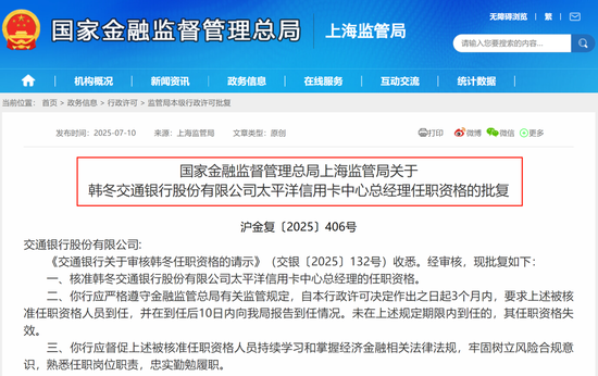 时隔半年,韩东的职务终于转正。2025年7月10日,其交行太平洋信用卡中心总经理的任职资格获核准。